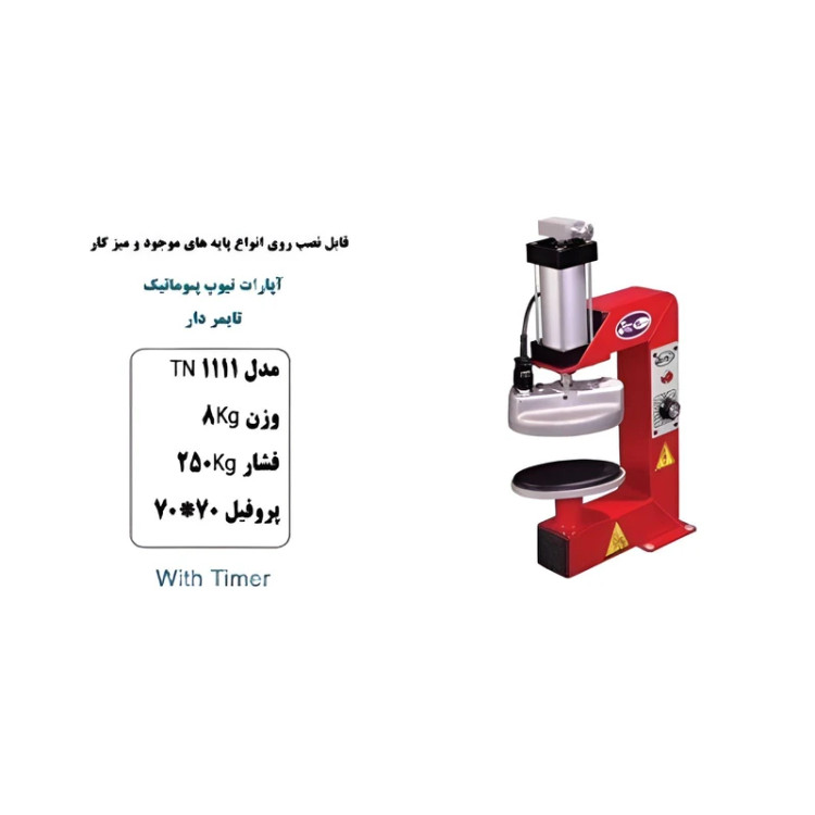 - دستگاه اپارات بادی مخصوص تیوپ TN دارای تایمر ۵ تا ۳۰ دقیقه، و چراغ سیگنال قابلیت آپارات انواع تیوپ. جک پنوماتیک سریع با قدرت فشار ۲۵۰ کیلوگرم. برق مصرفی ۲۲۰ ولت تکفاز.
